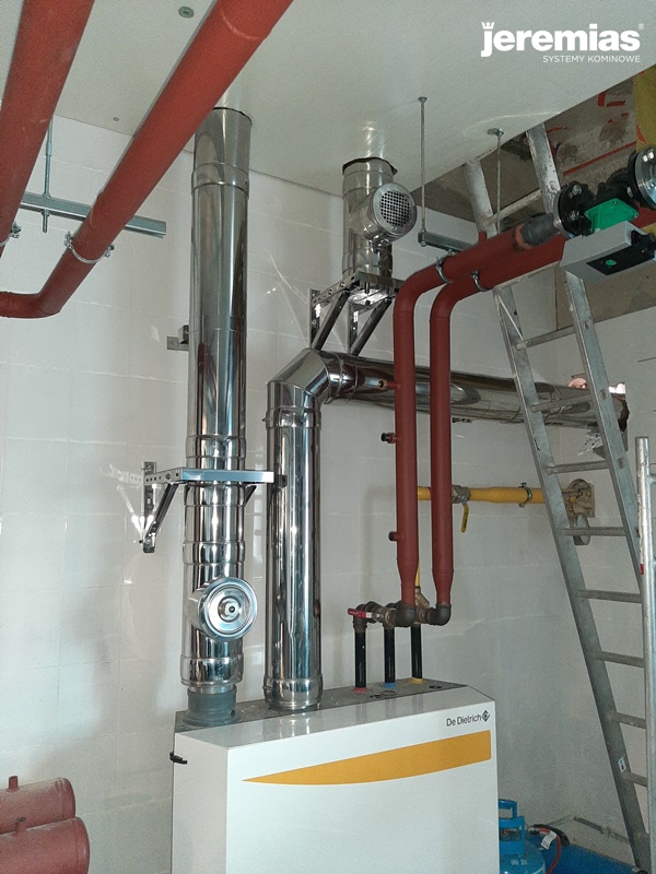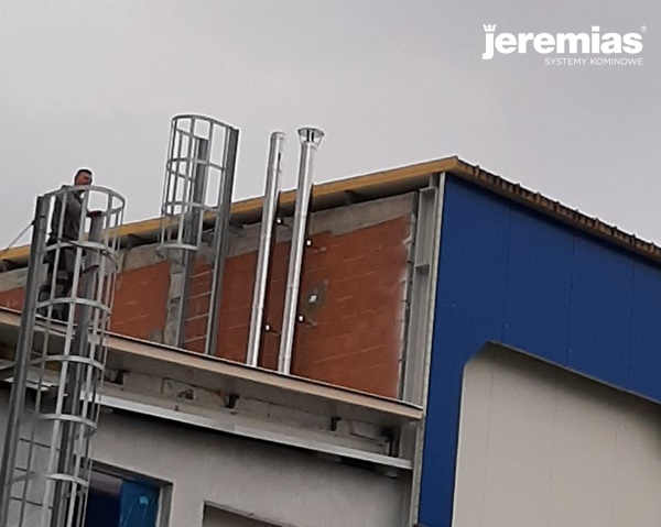 Dwa kominy DW-ECO 2.0 o średnicy 150 mm zamontowane. Odprowadzanie spalin oraz wentylacja wywiewna z kotłowni technologicznej dla budynku chłodni.