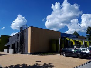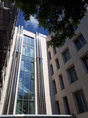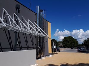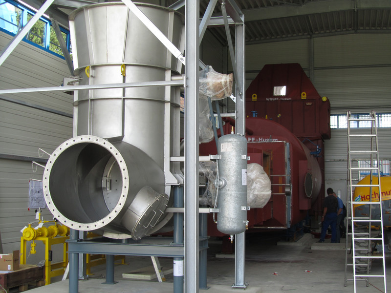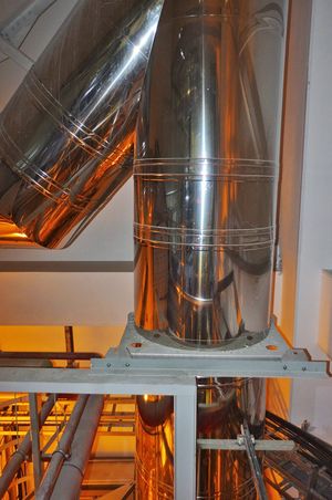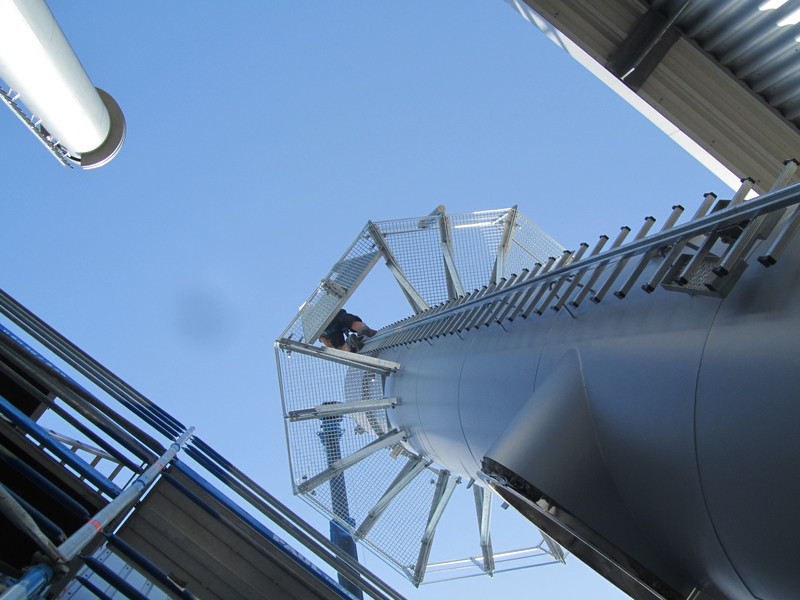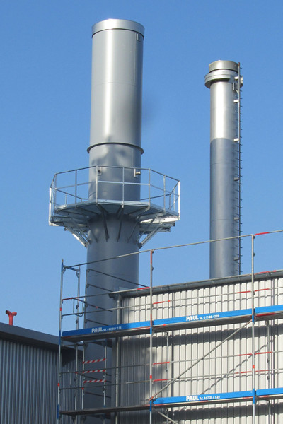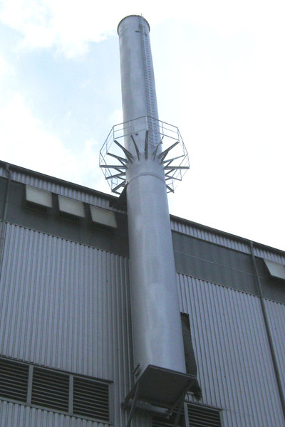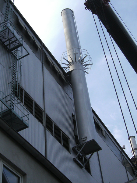 Ze względu na brak miejsca, obejściowy komin został umieszczony na stalowej konstrukcji, wprowadzonej od dołu i wyposażonej w izolację akustyczną.