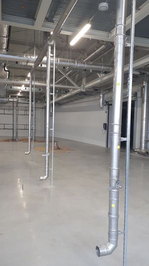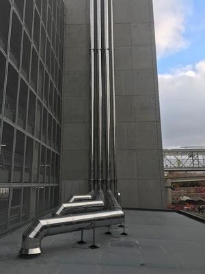 Blisko 400 m dwuściennego izolowanego DW ECO 2.0 i jednościennego EW ECO o średnicach 200 i 250 mm.Specjalne wyrzutnie w 48 otworach dachowych.